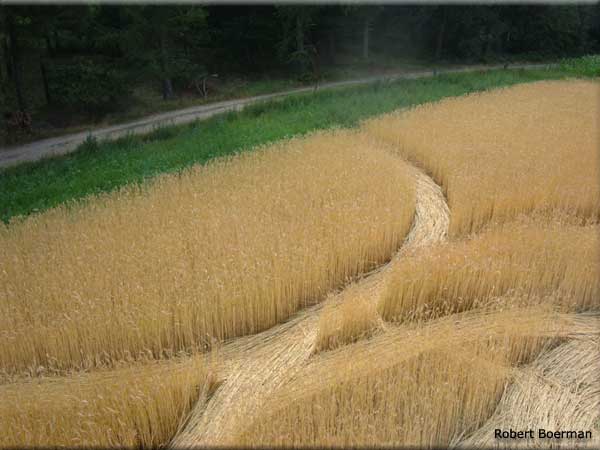 Op 4 juli werd door Aart Heus de eerste Nederlandse graancirkel van 2006 nabij Berg en Dal gemeld. Op 6 juli werd deze formatie door de stichting PTAH onderzocht. Conlusie: een slecht uitgevoerde hoax. Mensenwerk dus. In dit biologische graanveld (zonder spuitsporen) zijn de makers aan de rand van het veld begonnen met een halve ring (20 meter) te trekken. Van daaruit was goed te zien dat men vervolgens de grote ring om de middencirkel (11 meter) heeft gemaakt waarna men na het centrum van de cirkel gelopen is. Onder het platliggende graan van de cirkel was duidelijk een pad met voetsporen te zien waar de makers gelopen hadden. Wel hebben de makers hun uiteste best gedaan om enkele stengels en halmen met een aansteker (?) te verhitten en verschroeien (laatste foto). Verder zijn er geen leylijnen of verhoogde Boviswaarde gemeten en zijn er geen bijzonderheden aangetroffen.