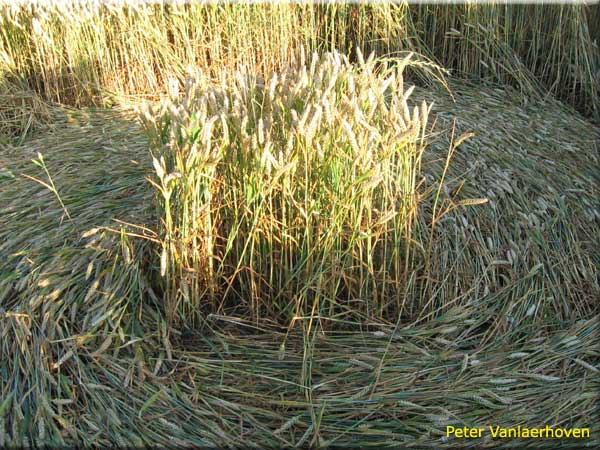 De grote cirkel meet 5 meter en de kleine 2,20 meter. In beide cirkels ligt het graan linksom. Na het een en ander gemeten te hebben komt de eigenaar aan scheuren die zo blij is met ons bezoek dat ie meteen maar even de politie belt. M.a.w. het bezoeken van deze cirkel wordt waarschijnlijk niet op prijs gesteld.