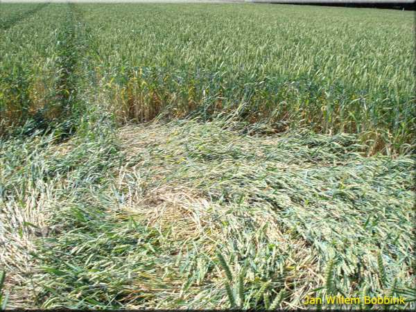Na enig zoekwerk (de formatie was absoluut niet zichtbaar vanaf diverse kanten van het veld) had ik de graancirkel eindelijk gevonden. Via de mail kreeg wij een melding dat de cirkel gevonden was tijdens een mountainbike tocht: onmogelijk. De eerste indruk was dat het graan erg rommelig plat gelegd was. Geen duidelijk scheiding tussen staand en plat gelegd graan.