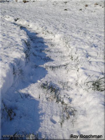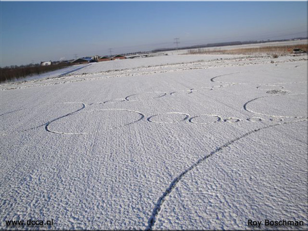 Roy legt me later uit dat het leek als of de sneeuw in de ringen en in de cirkel voor een centimeter of 7 met golvende beweging was weg geschraapt. Ook was hier en daar de afdruk te zien alsof er met een kam was gewerkt. Volgens zijn zeggen, en volgens de foto’s, zijn er geen voetafdrukken waargenomen of andere afdrukken wat het een en ander veroorzaakt zou kunnen hebben. Al met al een mysterieus fenomeen wat bij een volgende keer mij hopelijk niet meer zal ontgaan.