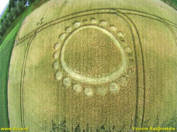 The DCCA-research team did ask the owner of the field for permission to do our research. This is okay, but he does not allow other people on his field. It is an egg-shaped ring with 23 circles laying just around it. A small distance further away there are laying another 3 circles.