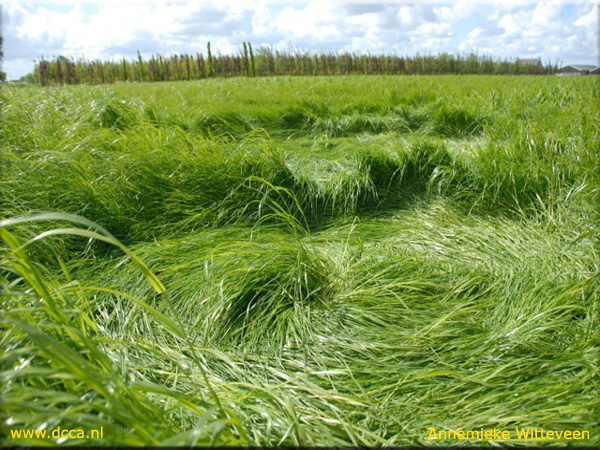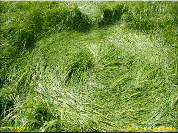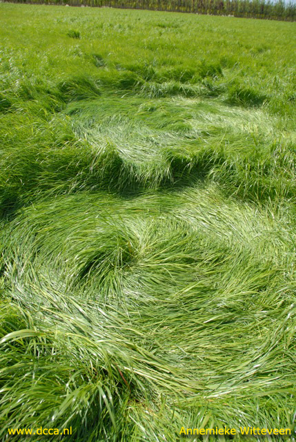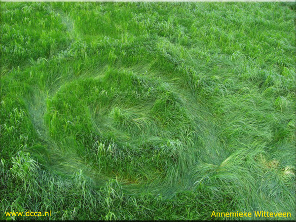 In the early hours of Wednesday May 16th Robbert van de Broeke again forefelt that there was a new cropcircle to be found in the area where he lives. The weatherconditions were though in the night the cropcircle was formed; heavy showers and stormy winds. The crop shows the effect of that. The grass is high, soon to be mowed, and goes down easily. Although I'm used to spotting crop cormations , and with the exact directions given by Roy Boschman, it was difficult to see the formation from the road, eventhough it was only a few feet away.