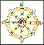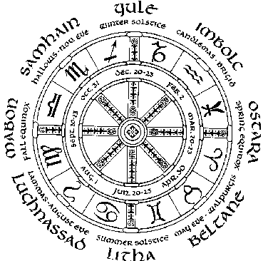 1. North – The short trident 2. Northeast – The crescent moon 3. East – The keyhole 4. Southeast – The heart of Bos, the bull 5. South – Cernunnos (nature) 6. Southwest – The Cosmos (consciousness) 7. West – The key of Mercury 8. Northwest – The cattle water trough 9. Centre – The Mabrysithe double axe (or Sun-wheel) © Tommy Borms 2004 |